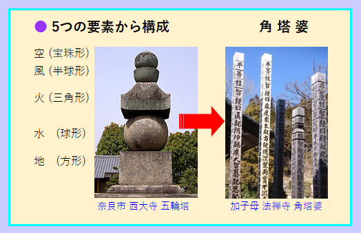 五輪塔も角塔婆も、世界の構成している五大物質を表し、上から、空・風・火・水・地の梵字が書かれ、その下に故人の戒名が書かれます。